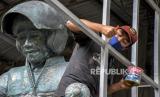 REPUBLIKA.CO.ID, BANDUNG -- Pekerja memasang rangka untuk mengemas patung Presiden Joko Widodo yang mengendarai sepeda motor di bengkel kerja NuArt Sculpture Park, Jalan Setra Duta Raya, Parongpong, Kabupaten Bandung Barat, Jumat (18/2/2022).