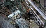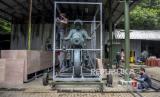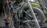 Pekerja memasang rangka untuk mengemas patung Presiden Joko Widodo yang mengendarai sepeda motor di bengkel kerja NuArt Sculpture Park, Jalan Setra Duta Raya, Parongpong, Kabupaten Bandung Barat, Jumat (18/2/2022). Patung Presiden Joko Widodo mengendarai sepeda motor yang terbuat dari tembaga kuningan karya I Nyoman Nuarta tersebut memiliki tinggi 3,6 meter dan panjang 6 meter. Patung tersebut akan dikirim dan dipasang di area Sirkuit Internasional Mandalika, Kabupaten Lombok Tengah, Nusa Tenggara Barat. Foto: Republika/Abdan Syakura (FOTO : REPUBLIKA/ABDAN SYAKURA)