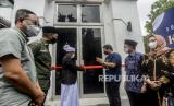 Direktur Bisnis dan Kewirausahaan Syariah Putu Rahwidhiyasa bersama Ketua Dewan Pembina ISYEF Arief Rosyid, Perwakilan Masjid Raya Al-Isra Ustaz Rizky, Ketua Umum ISYEF Atraz Mafazi (dari kiri ke kanan) dan Ketua Umum INKOWAPI Sharmila Yahya (kanan) saat meresmikan ISYEF Tower dan Kopi Umat (KOMAT) di Masjid Raya Al-Isra, Jakarta, Jumat (18/2/2022). ISYEF meluncurkan Isyef Tower dan Kopi Umat yang merupakan salah satu pusat pemberdayaan masjid dan komunitas remaja masjid melalui unit usaha kedai kopi, makanan dan minuman. (FOTO : Republika/Putra M. Akbar)