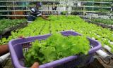 REPUBLIKA.CO.ID,SURABAYA -- Anggota Kelompok Rumah Pangan Lestari Serpis memeriksa kondisi sayur hidroponik di Kebun Kita, Surabaya, Jawa Timur, Jumat (18/2/2022). Meningkatnya konsumsi sayur saat terjadi lonjakan kasus COVID-19 di Surabaya menyebabkan permintaan sayur hidroponik di Kebun Kita meningkat dari biasanya terjual sekitar 50 kilogram per bulan menjadi 130 kilogram per bulan.