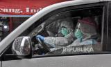 Petugas Public Safety Center (PSC) 119 berada di dalam ambulans usai mengevakuasi pasien Covid-19 bergejala ringan di Jalan Dago Pojok, Coblong, Kota Bandung, Jumat (10/2/2022). Berdasarkan data Pusat Informasi dan Koordinasi Covid-19 Jawa Barat (PIKOBAR), hingga (17/2/2022), kasus terkonfirmasi total sebanyak 887.131 kasus dengan rincian 147.882 kasus aktif, 724.372 orang sembuh dan 14.877 jiwa meninggal dunia. Foto: Republika/Abdan Syakura (FOTO : REPUBLIKA/ABDAN SYAKURA)