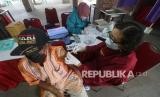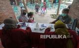 REPUBLIKA.CO.ID, Petugas kesehatan memeriksa kondisi kesehatan warga sebelum memberikan vaksin saat vaksinasi booster COVID-19 hari pertama di Taman Sekartaji, Kota Kediri, Jawa Timur, Sabtu (19/2/2022).