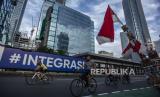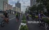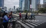 REPUBLIKA.CO.ID,JAKARTA -- Sejumlah warga bersepeda di kawasan Jalan Jenderal Sudirman, Jakarta, Ahad (20/2/2022).