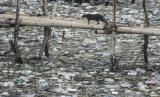 Seekor kucing melintasi jembatan bambu di antara sampah di kawasan perkampungan nelayan Cilincing, Jakarta, Ahad (20/2/2022). Jelang peringatan Hari Peduli Sampah Nasional (HPSN) 2022, Pemprov DKI Jakarta mengajak warga Jakarta untuk peduli sampah mulai dari lingkungan terdekat minimal dengan cara memilah sampah dari rumah. (FOTO : ANTARA/Aprillio Akbar)