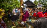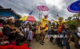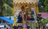 REPUBLIKA.CO.ID,HULU SUNGAI TENGAH -- Pasangan pengantin mengikuti prosesi Bausung (digendong) saat Tradisi Pengantin Banjar di Kecamatan Haruyan, Kabupaten Hulu Sungai Tengah, Kalimantan Selatan, Ahad (20/2/2022).