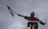 Seorang warga mengibarkan bendara Merah Putih saat berhasil memanjat pinang dengan kesenian Bapantul (Menggunakan Topeng) saat Tradisi Pengantin Banjar Di Kecamatan Haruyan, Kabupaten Hulu Sungai Tengah, Kalimantan Selatan, Ahad (20/2/2022). Tradisi pengantin tersebut menampilkan berbagai macam seni dan budaya seperti Bearak Naga, Bausung Pengantin, berbalas pantun, dan Bapantul yang merupakan adat istiadat suata perkawinan di Kalimantan Selatan serta melestarikan tradisi turun temurun adat Banjar. (FOTO : ANTARA/Bayu Pratama S)