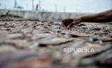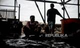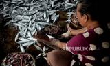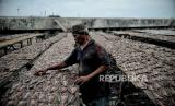 Pekerja menyelsaikan proses pembuatan ikan asin di Industri Pengasinan Kalibaru, Cilincing, Jakarta Utara, Senin (21/2/2022). Pengusaha ikan asin mengaku mengalami penurunan jumlah produksi sebesar 20 persen akibat terkendala cuaca saat proses penjemuran ikan asin. Pada musim kemarau, mereka biasanya membutuhkan waktu satu hari untuk menyelsaikan proses penjemuran, namun saat musim hujan penjemuran dilakukan hingga tiga hari. (FOTO : Republika/Thoudy Badai)