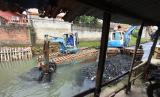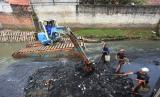 REPUBLIKA.CO.ID,JAKARTA -- Petugas menggunakan alat berat saat mengeruk tanah dan lumpur di Kali Mampang, Jakarta, Senin (21/2/2022).