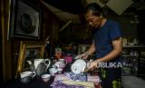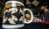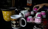 Perajin menata cangkir yang sudah direkatkan dengan batik di Say Galery, Sukmajaya, Depok, Jawa Barat, Senin (21/2/2022). Kerajinan batik rekat yang diaplikasikan ke berbagai media seperti gelas, cangkir, teko, piring dan pot tersebut dijual dengan harga Rp 50.000 hingga Rp 1.500.000, tergantung tingkat kesulitan dan telah dipasarkan ke seluruh daerah di Indonesia hingga mancanegara. Republika/Putra M. Akbar (FOTO : Republika/Putra M. Akbar)
