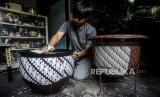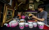 Perajin menyelesaikan pembuatan batik rekat pada media pot bunga di Say Galery, Sukmajaya, Depok, Jawa Barat, Senin (21/2/2022). Kerajinan batik rekat yang diaplikasikan ke berbagai media seperti gelas, cangkir, teko, piring dan pot tersebut dijual dengan harga Rp 50.000 hingga Rp 1.500.000, tergantung tingkat kesulitan dan telah dipasarkan ke seluruh daerah di Indonesia hingga mancanegara. Republika/Putra M. Akbar (FOTO : Republika/Putra M. Akbar)