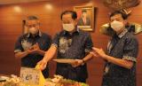 Presiden Direktur BCA Jahja Setiaatmadja (tengah) didampingi Wakil Presiden Direktur BCA Suwignyo Budiman (kiri) dan Wakil Presiden Direktur BCA Armand Wahyudi Hartono (kanan) secara simbolis memotong tumpeng di tengah acara perayaan HUT BCA ke-65 di Jakarta, Senin (21/2/2022). (FOTO : dok. Istimewa)