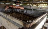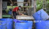 Warga memasukkan sampah organik untuk pakan Maggot (larva) dari Lalat Black Soldier Fly (BSF) yang dibudidayakan di Rumah Maggot GEMI 0418, Cipageran, Kota Cimahi, Selasa (22/2/2022). Warga yang tergabung dalam kelompok Gerakan Ekonomi Mandiri (GEMI) berinisiatif membudidayakan maggot lalat BSF sebagai solusi pengurangan dan pengurai sampah serta upaya membantu perekonomian warga. Dalam satu bulan, maggot tersebut mampu mengurai sampah organik atau sampah rumah tangga yang berasal dari kawasan tersebut hingga tujuh ton sampah. Foto: Republika/Abdan Syakura (FOTO : REPUBLIKA/ABDAN SYAKURA)