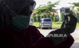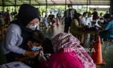 Petugas memeriksa kesehatan warga yang akan disuntik vaksin Covid-19 di Pondok Pesantren Minhajurrosyidin, Jakarta, Selasa (22/2/2022). Satgas Penanganan Covid-19 mencatat pada Senin (21/2/2022), total penerima vaskin Covid-19 dosis lengkap di Indonesia telah mencapai 140.420.471 orang. Republika/Putra M. Akbar (FOTO : Republika/Putra M. Akbar)