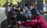 REPUBLIKA.CO.ID,JAKARTA -- Petugas kesehatan menyuntikan vaksin Covid-19 kepada warga di Pondok Pesantren Minhajurrosyidin, Jakarta, Selasa (22/2/2022).