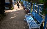 Pagar dicat warna biru dan putih di bantaran Sungai Code Jetisharjo, Yogyakarta, Rabu (23/2/2022). Warga RW 7 di Jetisharjo menghias dengan mengecat ruang terbuka hijau, pagar, tangga, dan dinding rumah dengan warna senada biru dan putih. Dengan penataan kembali wilayah ini diharapkan bisa membangkitkan kembali UMKM seperti sebelum pandemi Covid-19. Karena di Jetisharjo juga mengembangkan ekowisata jelajah kampung di Bantaran Sungai Code. (FOTO : Wihdan Hidayat / Republika)