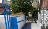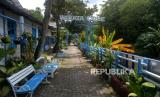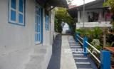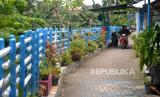 Pojok kampung yang ditata kembali di bantaran Sungai Code Jetisharjo, Yogyakarta, Rabu (23/2/2022). Warga RW 7 di Jetisharjo menghias dengan mengecat ruang terbuka hijau, pagar, tangga, dan dinding rumah dengan warna senada biru dan putih. Dengan penataan kembali wilayah ini diharapkan bisa membangkitkan kembali UMKM seperti sebelum pandemi Covid-19. Karena di Jetisharjo juga mengembangkan ekowisata jelajah kampung di Bantaran Sungai Code. (FOTO : Wihdan Hidayat / Republika)