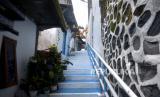 Tangga dalam kampung juga ikut diwarnai biru dan putih di bantaran Sungai Code Jetisharjo, Yogyakarta, Rabu (23/2/2022). Warga RW 7 di Jetisharjo menghias dengan mengecat ruang terbuka hijau, pagar, tangga, dan dinding rumah dengan warna senada biru dan putih. Dengan penataan kembali wilayah ini diharapkan bisa membangkitkan kembali UMKM seperti sebelum pandemi Covid-19. Karena di Jetisharjo juga mengembangkan ekowisata jelajah kampung di Bantaran Sungai Code. (FOTO : Wihdan Hidayat / Republika)
