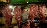 Pedagang menata daging sapi dagangannya di Pasar Jatinegara, Jakarta Timur, Rabu (23/02/2022). Harga daging sapi mengalami kenaikan dalam satu bulan terakhir dari Rp120 ribu menjadi Rp140 ribu per kilogram. Menurunya daya beli masyarakat selama pandemi covid-19 ditambah kenaikan harga daging sapi berakibat menurunnya omzet pedagang hingga 50 persen. (FOTO : Prayogi/Republika)