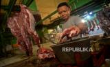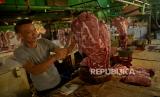 Pedagang memotong daging sapi dagangannya di Pasar Jatinegara, Jakarta Timur, Rabu (23/02/2022). Harga daging sapi mengalami kenaikan dalam satu bulan terakhir dari Rp120 ribu menjadi Rp140 ribu per kilogram. Menurunya daya beli masyarakat selama pandemi covid-19 ditambah kenaikan harga daging sapi berakibat menurunnya omzet pedagang hingga 50 persen.Prayogi/Republika. (FOTO : Prayogi/Republika)