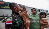 Prajurit Raider TNI mencium anak putrinya jelang pemberangkatan di Pelabuhan Umum Krung Geukuh, Aceh Utara, Aceh, Rabu (23/2/2022). Sebanyak 400 pasukan elite TNI Yonif Raider Khusus 113/Jaya Sakti Aceh diberangkatkan ke Papua untuk menjaga keamanan dan kedaulatan NKRI. (FOTO : ANTARA/Rahmad/hp.)