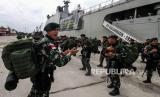 REPUBLIKA.CO.ID,ACEH UTARA -- Prajurit Raider TNI melakukan "yel-yel" disamping Kapal TNI AL jelang pemberangkatan di Pelabuhan Umum Krung Geukuh, Aceh Utara, Aceh, Rabu (23/2/2022).