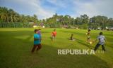 REPUBLIKA.CO.ID, PARIAMAN -- Sejumlah anak bermain bola di sisi luar lapangan sepakbola yang dibangun dari dana desa seusai peresmian di Desa Sikapak Timur, Kota Pariaman, Sumatera Barat, Rabu (23/2/2022). Pembangunan lapangan sepakbola tersebut dilakukan bertahap sejak tahun 2017 menggunakan dana desa sebesar Rp1,3 miliar, yang dilengkapi talud dan turap serta pendestrian agar tidak digenangi air, satu buah stadion mini, tribun, toilet, serta ruang ganti di sisi kiri dan kanan.