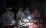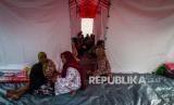 Pengungsi mengaji di dalam tenda pengungsian di Desa Curug Panjang, Lebak, Banten, Rabu (23/2/2022). Sebanyak 40 KK korban bencana pergerakan tanah di daerah tersebut memilih untuk tinggal di tenda pengungsian pada malam hari karena takut apabila terjadi hal yang tidak diinginkan. (FOTO : Antara/Muhammad Bagus Khoirunas)