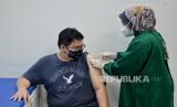 Tenaga kesehatan menyuntikan vaksin booster atau vaksin penguat jenis sinopharm di Klinik Kimia Farma, Jalan Radio Dalam, Jakarta, Kamis (24/2/2022). Menteri BUMN Erick Thohir kembali menggelar program vaksin gotong royong dengan membuka layanan vaksin booster jenis Sinopharm di 350 klinik Kimia Farma sebagai upaya percepatan pemerataam vaksinasi. Republika/Thoudy Badai (FOTO : Republika/Thoudy Badai)
