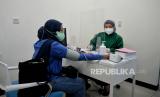 Tenaga kesehatan memeriksa kesehatan warga sebelum menyuntikan vaksin booster atau vaksin penguat jenis sinopharm di Klinik Kimia Farma, Jalan Radio Dalam, Jakarta, Kamis (24/2/2022). Menteri BUMN Erick Thohir kembali menggelar program vaksin gotong royong dengan membuka layanan vaksin booster jenis Sinopharm di 350 klinik Kimia Farma sebagai upaya percepatan pemerataam vaksinasi. Republika/Thoudy Badai (FOTO : Republika/Thoudy Badai)