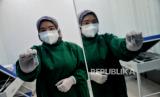 Tenaga kesehatan menunjukan tabung vaksin jenis sinopharm di Klinik Kimia Farma, Jalan Radio Dalam, Jakarta, Kamis (24/2/2022). Menteri BUMN Erick Thohir kembali menggelar program vaksin gotong royong dengan membuka layanan vaksin booster jenis Sinopharm di 350 klinik Kimia Farma sebagai upaya percepatan pemerataan vaksinasi. Republika/Thoudy Badai (FOTO : Republika/Thoudy Badai)