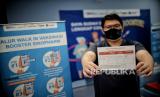 Warga menunjukan surat vaksin usai menerima vaksin booster atau vaksin penguat jenis sinopharm di Klinik Kimia Farma, Jalan Radio Dalam, Jakarta, Kamis (24/2/2022). Menteri BUMN Erick Thohir kembali menggelar program vaksin gotong royong dengan membuka layanan vaksin booster jenis Sinopharm di 350 klinik Kimia Farma sebagai upaya percepatan pemerataam vaksinasi. Republika/Thoudy Badai (FOTO : Republika/Thoudy Badai)