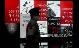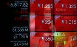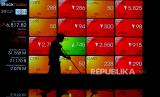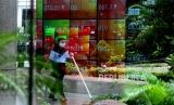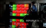 REPUBLIKA.CO.ID, JAKARTA -- Petugas kebersihan beraktivitas di dekat layar pergerakan Indeks Harga Saham Gabungan (IHSG) di gedung Bursa Efek Indonesia, Jakarta, Kamis (24/2/2022). Indeks Harga Saham Gabungan (IHSG) ditutup melemah 102,23 poin atau turun 1,48 persen ke level 6.817,82