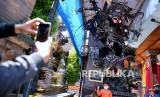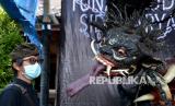 REPUBLIKA.CO.ID, DENPASAR -- Warga berfoto di dekat Ogoh-ogoh berjudul Gerubug karya kelompok pemuda ST. Tunas Muda di Sidakarya, Denpasar, Bali, Minggu (27/2/2022). Ogoh-ogoh yang akan diarak pada malam pengrupukan atau sehari sebelum Hari Raya Nyepi yang terbuat dari bahan-bahan ramah lingkungan serta masker menggambarkan kondisi kehidupan sosial, budaya dan ekonomi masyarakat selama masa pandemi COVID-19.