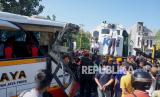 REPUBLIKA.CO.ID, TULUNGAGUNG -- Petugas mengevakuasi jenazah korban kecelakaan bus pariwisata PO Harapan Jaya yang tertabrak KA Rapih Doho di perlintasan kereta api tanpa palang pintu di Desa Ketanon, Tulungagung, Jawa Timur, Ahad (27/2/2022).