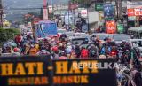 Sejumlah pengendara antre di jalur wisata Puncak, Cisarua, Kabupaten Bogor, Jawa Barat, Ahad (27/2/2022). Tingginya antusiasme masyarakat untuk berwisata pada libur akhir pekan dan libur Isra Miraj Nabi Muhammad SAW, mengakibatkan kepadatan kendaraan di jalur Puncak Bogor sehingga Satlantas Polres Bogor melakukan rekayasa buka tutup jalur untuk mengurai kepadatan kendaraan. (FOTO : Antara/Yulius Satria Wijaya)