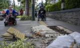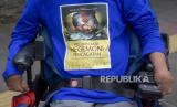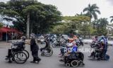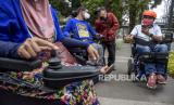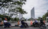 REPUBLIKA.CO.ID, BANDUNG -- Sejumlah penyandang difabel menggunakan kursi roda melintas di dekat Monumen Perjuangan Covid-19 saat peringatan Hari Kursi Roda Internasional di Jalan Wirayuda Barat, Kota Bandung, Selasa (1/3/2022).