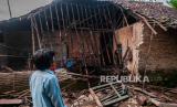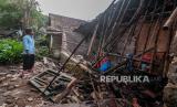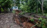 Seorang warga melihat kondisi bagian rumah yang roboh akibat pergerakan tanah di Desa Curug Panjang, Lebak, Banten, Senin (28/2/2022). Rumah rusak akibat pergerekan tanah yang terjadi daerah itu bertambah menjadi 50 rumah seiring dengan seringnya hujan deras mengguyur kawasan tersebut. (FOTO : ANTARA/Muhammad Bagus Khoirunas)