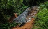 Kondisi bangunan sekolah yang amblas di MTs Ar Ribathiyah, Lebak, Banten, Senin (28/2/2022). Hujan deras yang terjadi beberapa hari terakhir di daerah tersebut mengakibatkan bangunan sekolah terancam longsor dan sebagian ruang kelas amblas sedalam 20 meter. (FOTO : ANTARA/Muhammad Bagus Khoirunas)