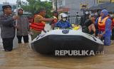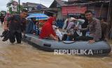 REPUBLIKA.CO.ID, SERANG -- Sejumlah personel Brimob Polda Banten dengan menggunakan perahu karet mengevakuasi warga yang terjebak banjir di Kampung Pekarungan Kota Serang, Banten, Selasa (1/3/2022). Banjir terjadi akibat luapan Sungai Cibanten setelah terjadi hujan dengan intensitas tingi sejak Senin (28/2). Akibatnya air tercurah melampaui daya tampung Waduk Sindangheula yang ada di hulu Sungai dan menimbulkan banjir di sejumlah titik di Kota Serang.