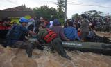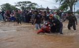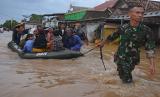 REPUBLIKA.CO.ID,SERANG -- Personel TNI menarik perahu karet saat mengevakuasi warga korban banjir di Kasemen, Kota Serang, Banten, Selasa (1/3/2022).