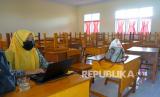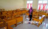 REPUBLIKA.CO.ID, GORONTALO -- Seorang guru berada di ruang kelas yang kosong di Sekolah Dasar Negeri 3, Bulango Timur, Kabupaten Bone Bolango, Gorontalo, Jumat (4/3/2022). Pemerintah Kabupaten Bone Bolango kembali menerapkan sekolah daring mulai tanggal 4 hingga 18 Maret 2022 menyusul ditetapkannya daerah itu menjadi zona merah penyebaran COVID-19.