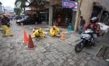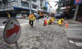 REPUBLIKA.CO.ID, JAKARTA -- Petugas Sudin Bina Marga Jakarta Pusat mengerjakan proyek perbaikan jalan rusak di kawasan Jalan Pasar Baru, Jakarta, Jumat (4/3/2022). Perbaikan tersebut dilakukan pada sejumlah jalan di areal Pertokoan Pasar Baru yang berada di kawasan Jakarta Pusat untuk memberikan kenyamanan saat berkendara.