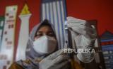 Petugas menyiapkan vaksin Covid-19 untuk disuntikan kepada warga di RPTRA Tanah Merdeka, Ciracas, Jakarta, Sabtu (5/3/2022). Kementerian Kesehatan mencatat sebanyak 146.577.204 jiwa atau 70,38 persen masyarakat Indonesia sudah menerima vaksinasi dosis kedua Covid-19. (FOTO : Republika/Putra M. Akbar)