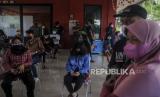 Sejumlah warga menunggu giliran untuk disuntik vaksin Covid-19 di RPTRA Tanah Merdeka, Ciracas, Jakarta, Sabtu (5/3/2022). Kementerian Kesehatan mencatat sebanyak 146.577.204 jiwa atau 70,38 persen masyarakat Indonesia sudah menerima vaksinasi dosis kedua Covid-19. (FOTO : Republika/Putra M. Akbar)
