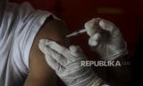 Petugas menyuntikan vaksin Covid-19 kepada warga di RPTRA Tanah Merdeka, Ciracas, Jakarta, Sabtu (5/3/2022). Kementerian Kesehatan mencatat sebanyak 146.577.204 jiwa atau 70,38 persen masyarakat Indonesia sudah menerima vaksinasi dosis kedua Covid-19. Republika/Putra M. Akbar (FOTO : Republika/Putra M. Akbar)