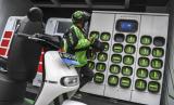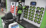 REPUBLIKA.CO.ID, JAKARTA -- Seorang pengemudi ojek daring menukar baterai sepeda motor listrik dengan yang sudah penuh terisi di Stasiun Penukaran Baterai Kendaraan Listrik Umum (SPBKLU) di SPBU Pertamina, Jalan MT Haryono, Jakarta, Jumat (4/3/2022).