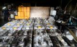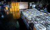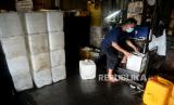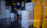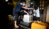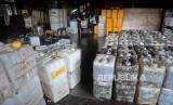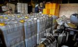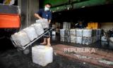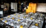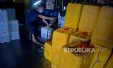 Pekerja menata jeriken yang berisi minyak goreng di salah satu agen penjualan minyak goreng di Jakarta, Senin (7/3/2022). Kementerian Perdagangan (Kemendag) RI memastikan bahwa stok minyak goreng aman saat masyarakat Indonesia menyambut bulan suci Ramadhan pada awal April 2022 mendatang.Prayogi/Republika. (FOTO : Prayogi/Republika)