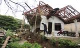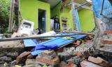 REPUBLIKA.CO.ID,CIREBON -- Warga melihat kondisi bagian rumah yang roboh akibat pergerakan tanah di Desa Ciwaringin, Kabupaten Cirebon, Jawa Barat, Senin (7/2/2022).