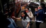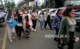 Sejumlah Pekerja Migran Indonesia (PMI) yang telah berhasil di evakuasi dari Ukraina berjalan menuju bus usai mengikuti pelepasan PMI dari Ukraina ke Daerah Asal di Kantor BP2MI, Jakarta, Senin (7/3/2022). Sebanyak 26 PMI dipulangkan ke daerah asal usai tiba dari Ukraina dan telah menjalani isolasi sejak 3 Maret lalu.Prayogi/Republika. (FOTO : Prayogi/Republika)