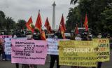 REPUBLIKA.CO.ID,JAKARTA -- Sejumlah massa aksi melaksanakan unjuk rasa di kawasan Patung Kuda, Jakarta, Selasa (8/3/2022).